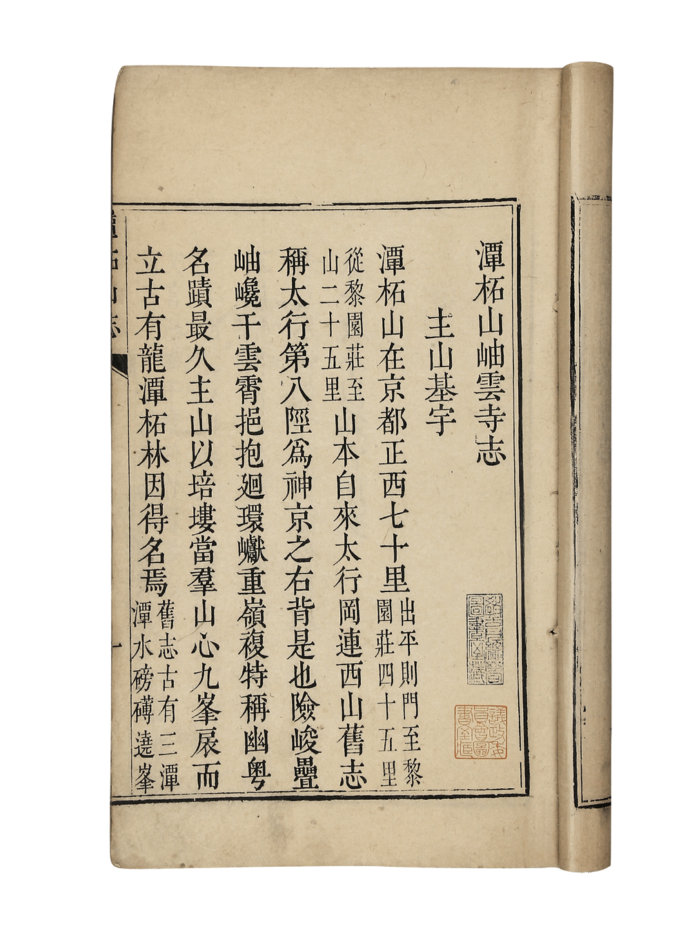 提 要: 是书为上好竹纸印本,行格舒朗,字形整饬,刊印俱佳。该书为辑录京西名刹潭柘山寺的历史、建制、名胜、歌咏等的专门志书。《潭柘山岫云寺志》最早有清乾隆四年刻本,神穆德撰,分为主山基宇、梵刹原宗、中兴重建、历代法统、行幸颁赐、名胜古迹等六门。后光绪九年,义庵复辑一卷,辑古体诗八首及各代律师传记。后人将此二卷合刻于一帙。今观此本并无义庵所辑内容,且文中“弘”字避讳极严,而“宁”、“贮”字均不避清讳,知为乾隆四年原刻无疑,颇为难得。