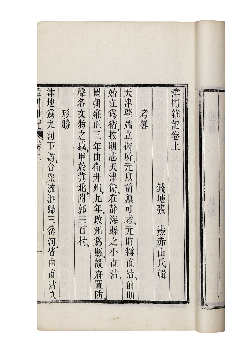 提 要: 是书为白纸印本,老装未衬,原签或存,天头开阔,字形方整。首收“天津县境舆图”、“天津城厢图”各一幅。该书为天津地方志之集大成之作,记述了天津之繁盛,舟车之往来,生意之利弊,市井之琐谈及城池、河道、衙署、祠庙、茶园、酒馆、中外交涉、文人诗词等,是研究津门文化、历史、风俗、人文的珍贵资料。