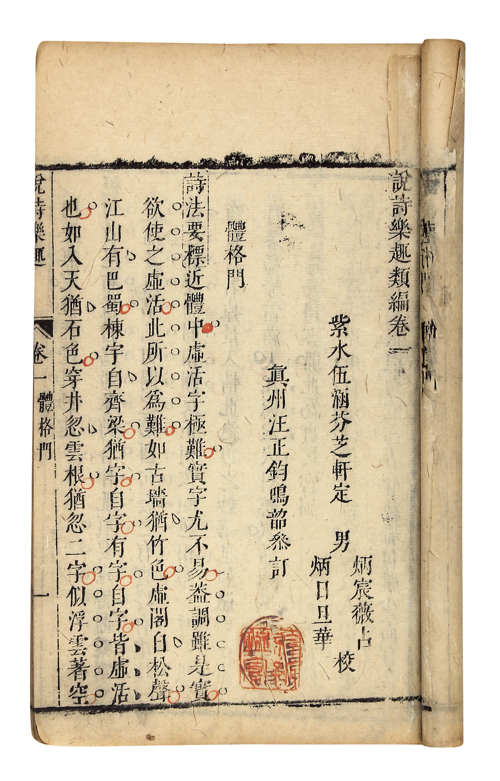 是书为竹纸印本,书前有毛际可序,后为伍涵芬自序,次汪正钧、朱庭柏序。此书流传甚少,查《中国古籍善本总目》,仅北大等四家有藏。原书二十卷,拍品缺后二卷。