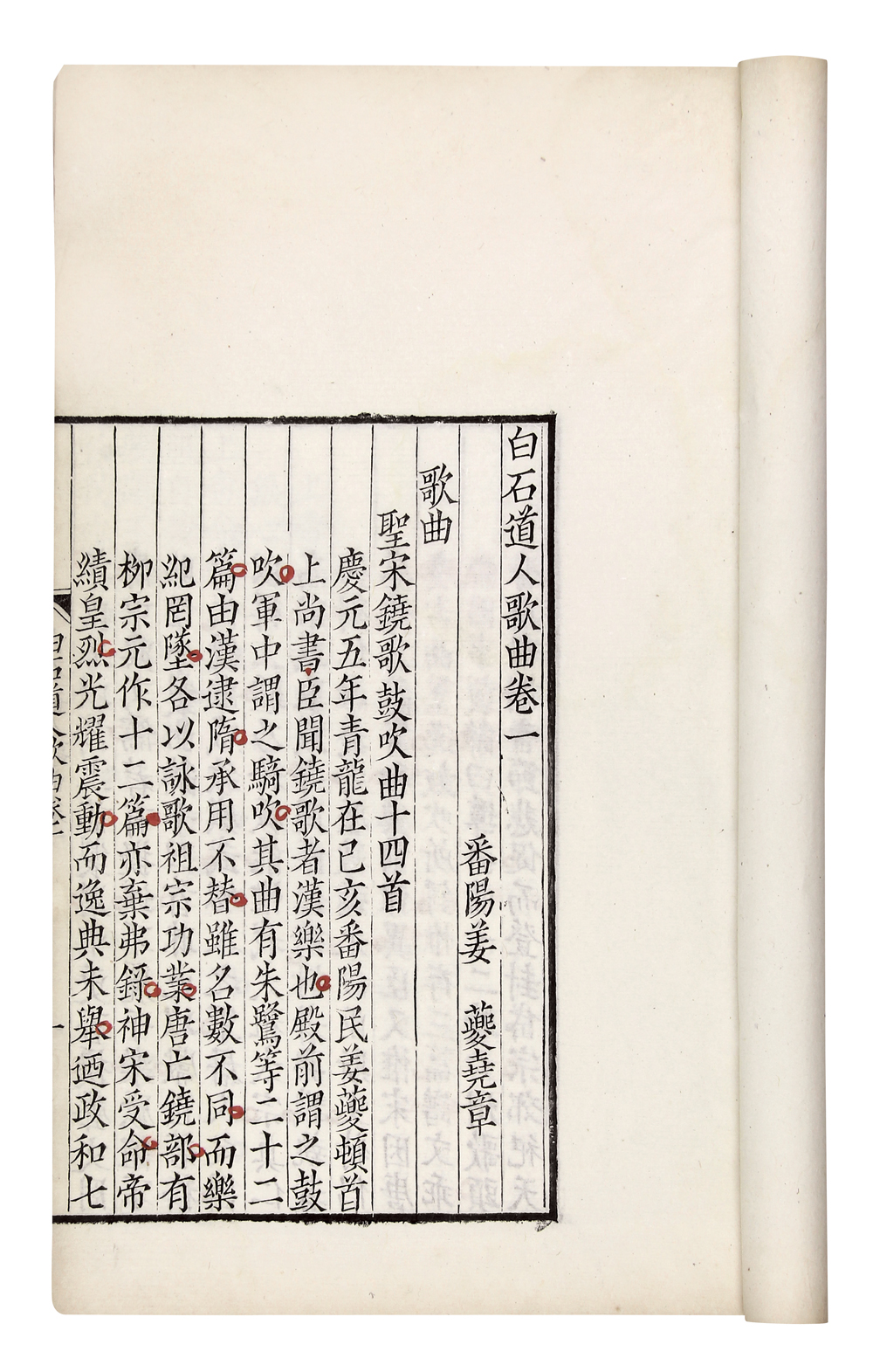 是书为白纸印本,写刻上板,牌记页为罗纹纸。此为南宋词人姜夔诗词集。姜夔,别号白石道人。