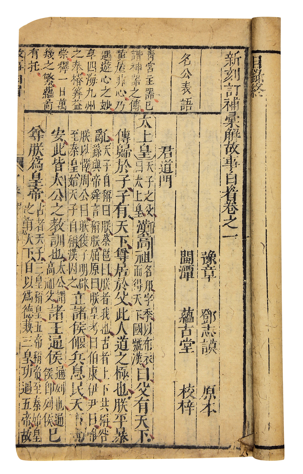 是书老装,竹纸未衬,二截楼版式,字形方整,此书前有邓志谟序。该书十卷,以君道、人道、文学、人事、珍宝等各自为部,举凡名物之繁,事迹之琐,一览无遗。