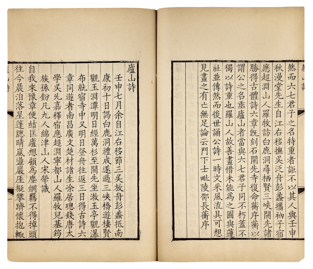 提 要: 是书老装未衬,原签尚存,天头开阔,全书字体尽取峭丽之势,笔锋锐利,迥异于清三代刻本奢靡甜腻的版刻之风。康熙三十一年(1692),宋荦遵定例由江西巡抚右移江宁巡抚,由水路赴任。与楚材、凃居璁、子宋基等人同游庐山诸胜,得古体诗六章,刻石于开先寺。拍品即为此六章古体诗的刻本。后附《探梅诗》不分卷,乃康熙三十二年宋荦与友人等过灵岩元墓看梅花同得咏梅诗若干首,集结成卷。此二种前均有邵长蘅序,分别写于康熙三十一年与康熙三十二年,详述二种之由来。邵长蘅(1637-1704),一名衡,字子湘,号青门山人,武进人。诸生,以