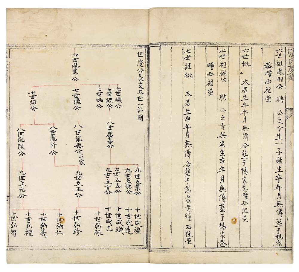 拍品为张氏族谱,该支于明成化年间入山东登州蓬莱县。首序三则,次凡例,次閤族塋图式(此图乃乾隆三十一年重修,且由该支十世孙张侃亲刻),以上均为刻本。而再次的谱系图,则是手录而成,略记先人名讳、号、生辰等信息。
