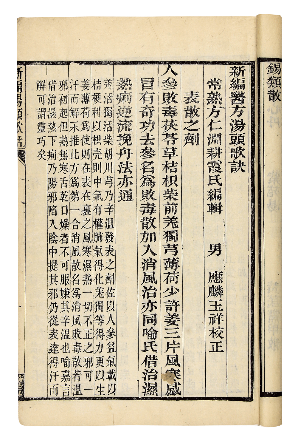 是书为竹纸印本,字迹清晰,品相完好。古代医方著作,包括发表、补益等类,每方后附简要说明。书首有九石老人徐元霖序言一篇,末尾附舌胎歌。