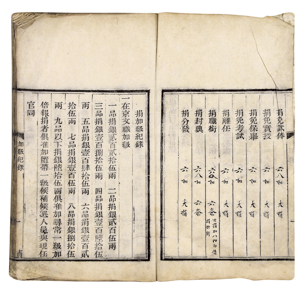 提 要: 是书线装一厚册,天头极为敞阔,字形方整。此书为清朝官方颁布的捐纳事例之一种。捐纳是一种卖官鬻爵的制度,始于秦代,至清朝遂成条例。清代的捐纳分为两种,一为暂行事例,主要捐实职;另一为现行事例,主要捐虚衔。拍品即捐虚衔所行使的现行常例,详细标明加级、复降革留任、入补班、免保举、免考试等所需捐之银数量。