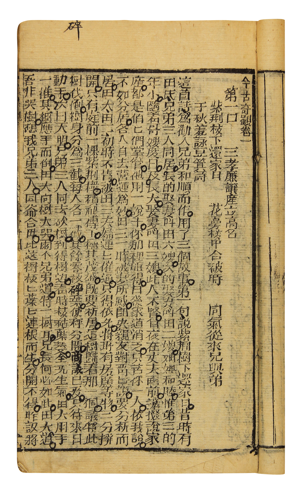 是书为竹纸印本,小字刷印,排列颇密。作者为抱瓮老人,其真实姓名及生平事迹不详,一说为冯梦龙的文友。该书选录明代话本小说四十篇,其中出自冯梦龙“三言”二十九篇,选自凌蒙初刻“二拍”的有十一篇。
