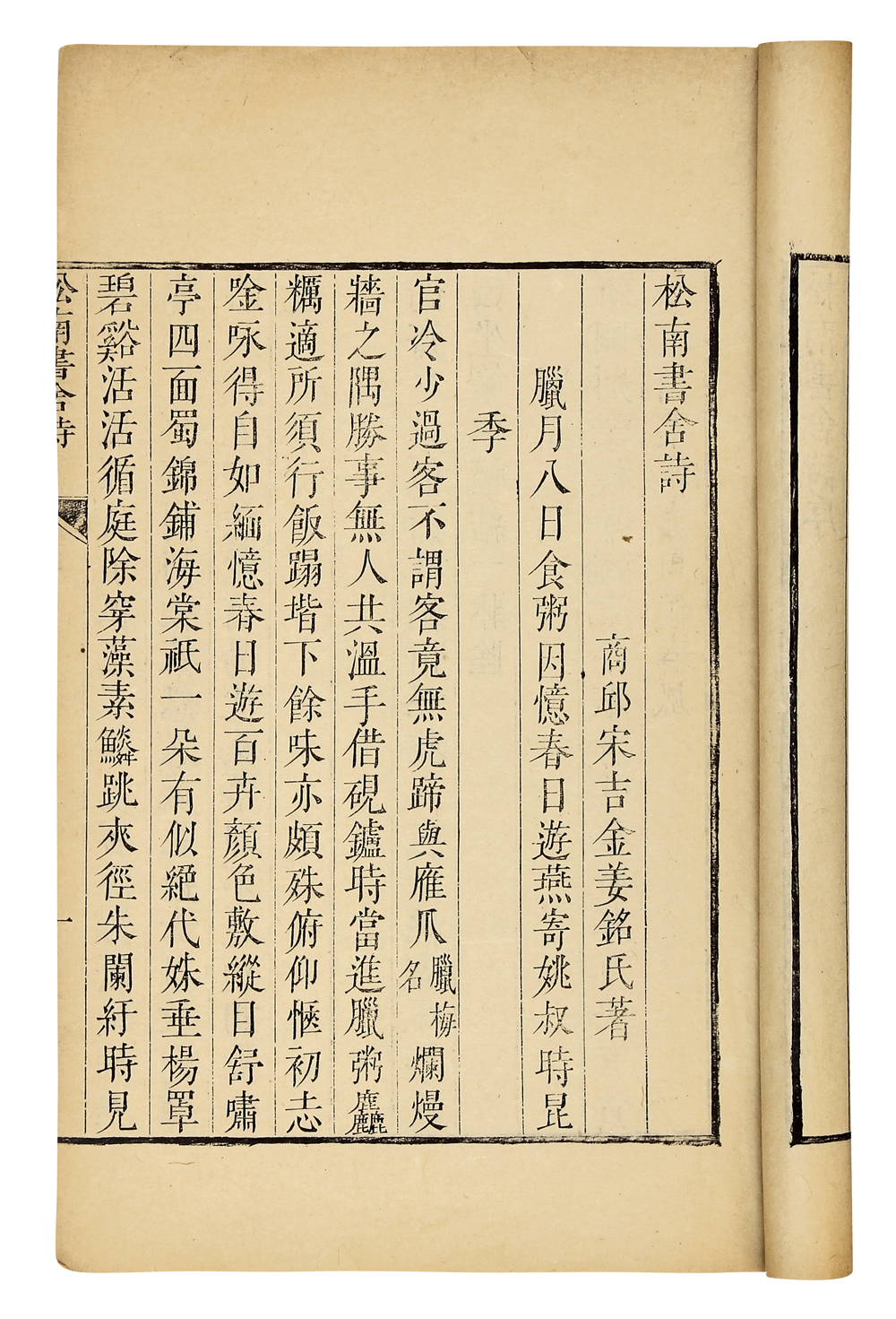 提 要: 是书老装未衬,天头宽阔,行格疏朗,字取宋体,抚印精审,点划清晰爽利,为较初印之本。此书乃宋吉金诗集,收诗四十首左右。宋吉金(1672-©),字姜铭,河南商丘人,宋荦之孙。贡生,官至湖南宝庆府知府,诰授朝议大夫。前有乾隆十年族弟宋华金刻书序,言吉金之子从其父遗留中得《松南书舍诗》一册,系四十余年前宋荦点定者,遂加编次付梓,是为此书。该书存世极为稀少,遍查《贩书偶记》、《清人别集总目》、《中国丛书综录》等均未见著录,值得珍藏。