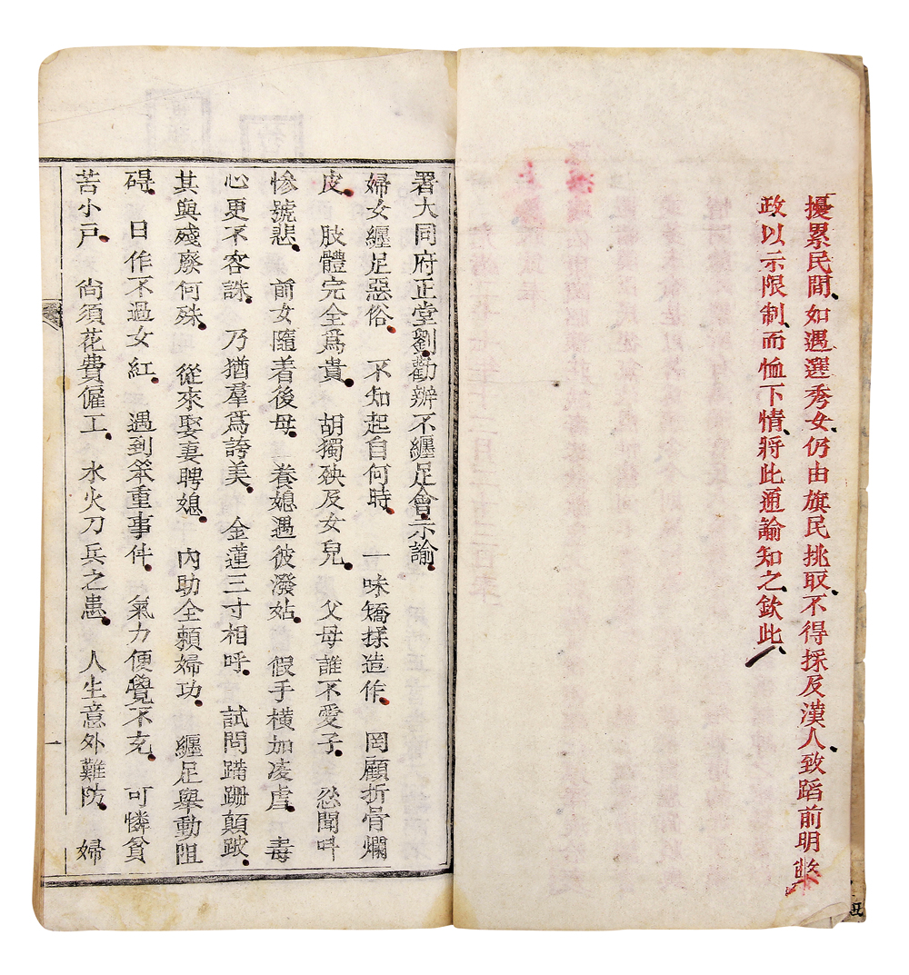 是书为白纸印本,为空白名簿。书首硃印光绪二十七年十二月二十三日发布上谕,言开除满汉不通婚姻的禁令,并以缠足有乖造物之和,劝戒缠足。次大同府劝戒缠足示谕。