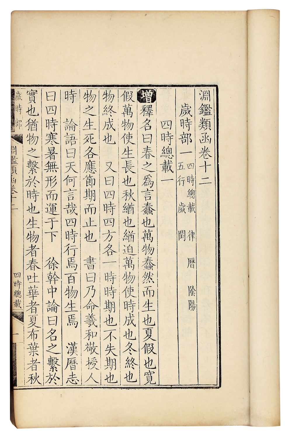 拍品存岁时部卷十二、十三,老装未衬,天头开阔,字形镌刻精整,较初印。此书资料丰富精审,皆注出处,《四库总目提要》评其“务使远有所稽,近有所考,源流本末,一一粲然”,是一部供检索唐宋以至明嘉靖时的典故、词藻及其源流的工具书。
