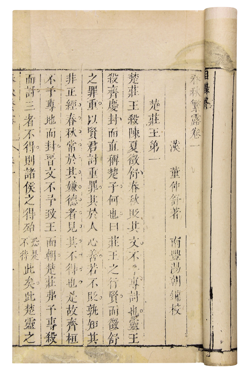 是书为清王谟辑《增订汉魏丛书》之零种,为竹纸印本,行格舒朗,宋体字镌刻精整。此书为中国汉代哲学家董仲舒的政治哲学著作,为汉代中央集权的封建统治制度,奠定了理论基础。