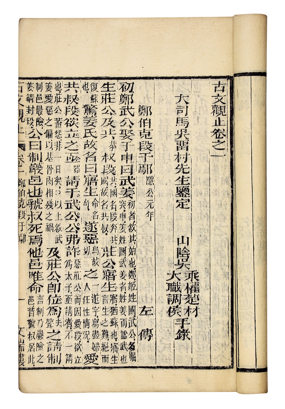 是书为清人吴楚材、吴调侯于康熙三十三年选定的古代散文选本,选录了从先秦到明朝的文章二百三十余篇,共六卷。前有康熙三十四年吴兴祚序,称此书“正蒙养而裨后学”。