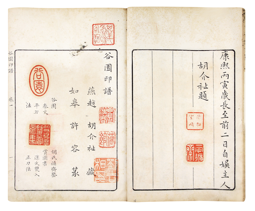 提 要: 是书为开化纸印本,开本敞阔,老装旧函。全书手写上板,印文清晰,品相较佳。 此书共有四卷本与六卷本之别。查《中国古籍善本总目》可知,六卷本全国仅北京市东城区图书馆、上海图书馆、吉林省图书馆三家有藏,而四卷本则多达十余家有藏。而查历年拍卖纪录,四卷本曾拍卖数次,成交价基本在数万元左右。而六卷本则曾在2011年保利春季拍卖会上以40余万元的价格成交过一部,可见收藏界对六卷本的追捧。 此本辑录胡介祉所藏印数百枚,每页钤一枚至六枚不等,印文下方有文释。卷首有胡介祉康熙年序文二篇,皆钤胡介祉自用印。胡介祉,字循斋
