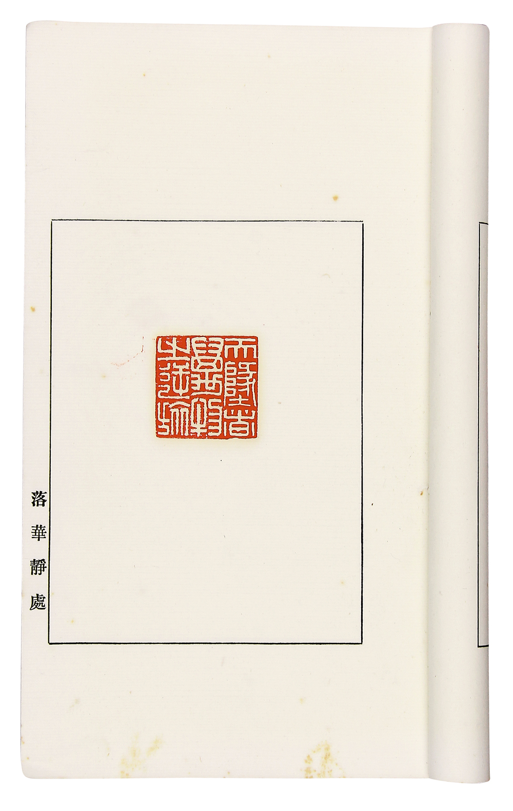 是书原签存,揽卷之下,白纸硃印,颇为悦目。内容为李白的《春夜宴桃李园序》,分为二十五方,印製精美。版心下方有排印“落华静处”字样。据查,清中期肥城湖屯人朱其镜,善篆刻,有《春夜宴桃李园序》(又名《春夜宴桃李园序》)、《陋室铭》诸印谱,名曰《陶峰小课》。拍品或即朱其镜所治之印。