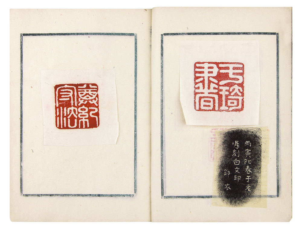 拍品线装为一册,白纸蓝绿框,硃印大部分是贴裱于书册之中。