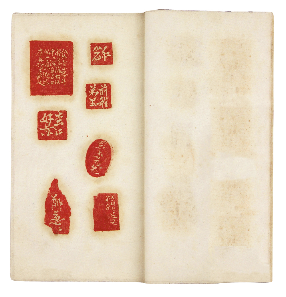 拍品为印谱集一册,封面手写“鹤翁石室”,为白纸钤印本,内收硃印甚夥,印文字体各异,布局疏密有致,观其印文内容,当为近现代篆印手钤。