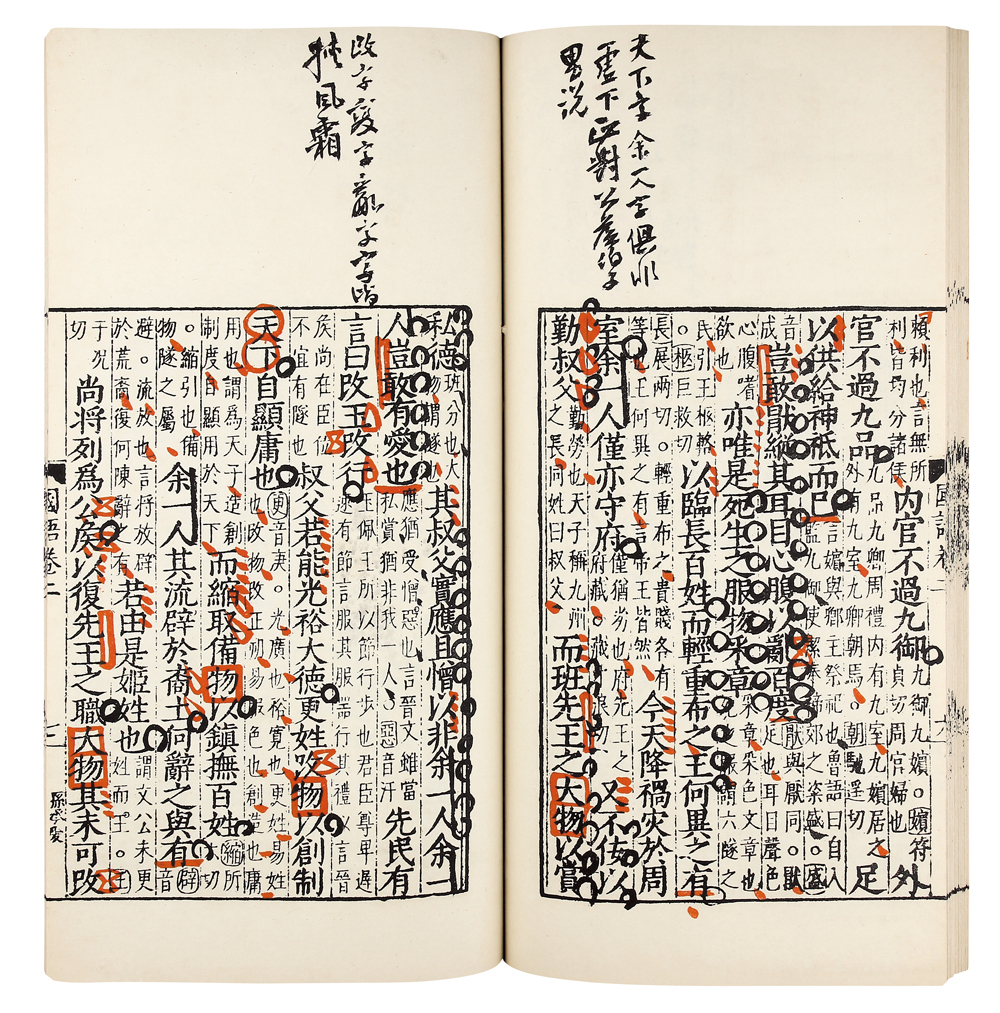 是书开本极为宏阔,原装原签,原装云头函套,製作精细,华美大方,品相较佳。该书据王觉斯手批明版《国语》本影印而成。其文笔老到,观点鲜明,不愧为一代大家。书后附有张香海、丁葆筠、胡嗣源、宝熙、袁金铠长跋。王觉斯,明代著名学者,性喜校书,藏书,尤善书法。