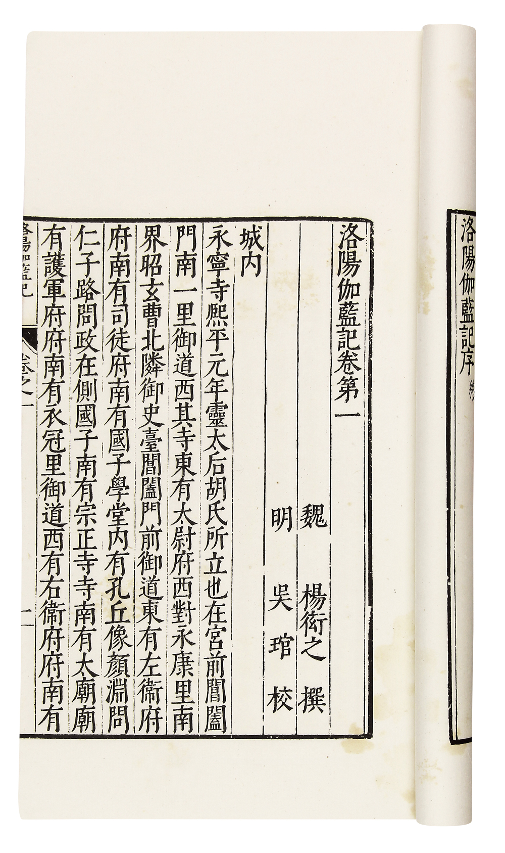 是书为白纸印本,底本为明万曆吴琯刻本。是一部集历史、地理、佛教、文学于一身的名著,书中历数北魏洛阳城的佛寺,分城内、城东、城西、城南、城北五卷叙述,对寺院的缘起变迁、庙宇的建製规模及与之有关的名人轶事、奇谈异闻都记载详核。
