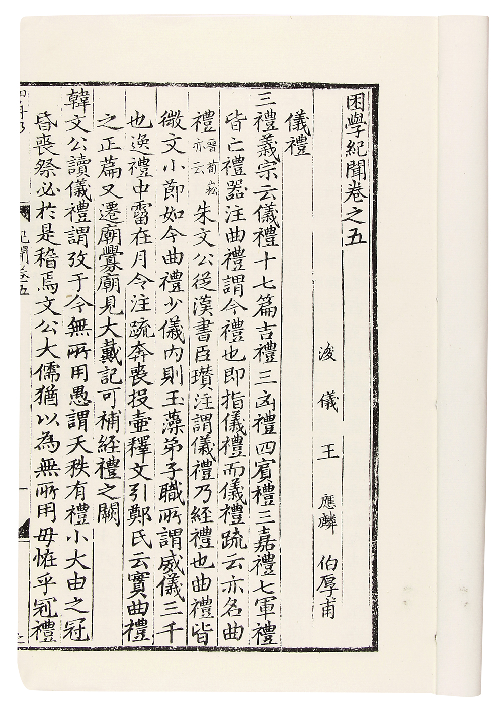 此书为南宋著名学者王应麟所撰以经学为重点的学术专著,与《容斋随笔》、《梦溪笔谈》并称宋代考据笔记三大家。白纸印本,字大清晰,印製精良,品相完好。王应麟,(1223-1296),字伯厚,号深宁,庆元府鄞县人(今浙江鄞县),南宋末年经史学者、文字学家。
