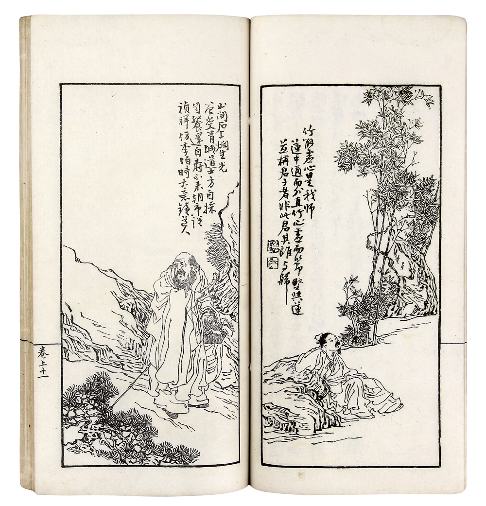 提 要: 是书为白纸石印本,原签俱存,刷印精美。此为马涛集名人诗谱为图,包括“理臻摩詰”和“停雲小愒畫勝”二卷,收图计一百二十二幅,人物形态生动,线条勾勒遒劲,疏密变化有致,用笔老到。马涛字镜江,浙江海宁人,晚清光绪年间人,流寓沪上鬻画为生。工人物,宗陈老莲,风神俊逸。有《镜江画谱》、《诗中画》行于世。