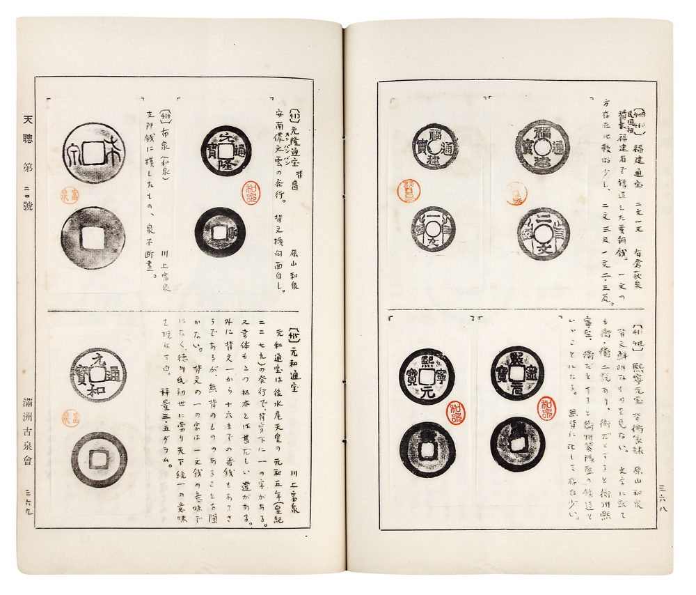 此书为伪满洲国时成立的满洲古泉会所出版的会刊,每册中的古泉均为拓印而成,并未使用传统的印刷技术印製,颇具特色。拍品存第十九、二十、二十三与二十五共四期。