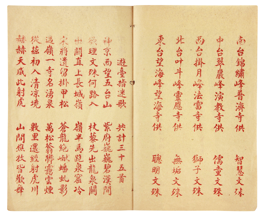 拍品为硃印本一册,文字均手写上板,字取颜体。其内容是清郑()作《游台指迷歌》。