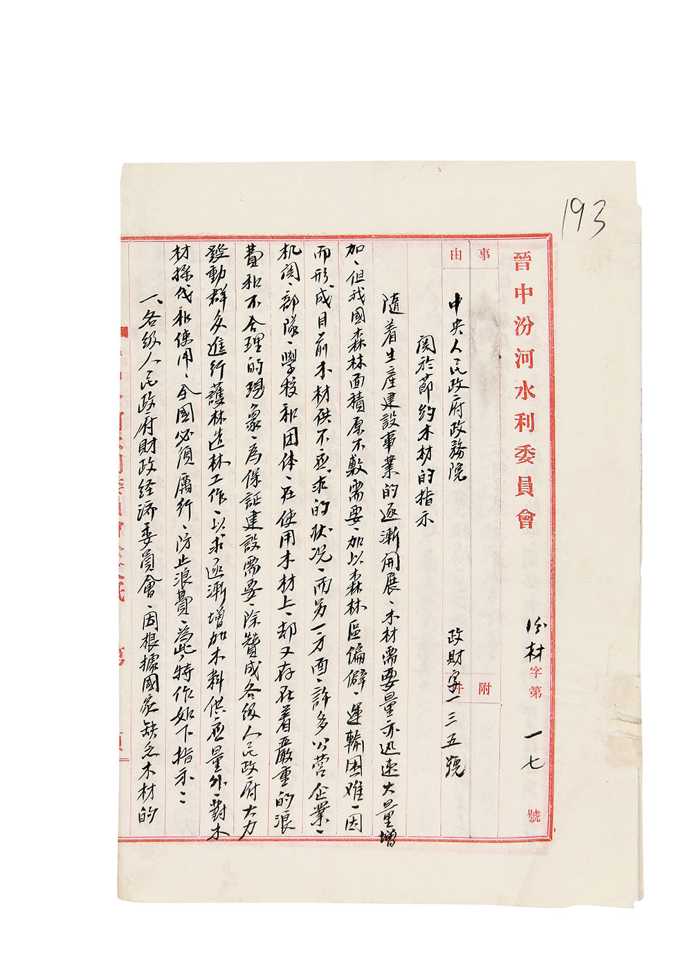 拍品为1950、1951年度晋中汾河水利委员会的档案,有墨笔写本、钢笔写本,也有复印件。内容包括通知、公函、批复、指示、指令等,还有工作计划、河渠灌溉计划、人工水利工程计划等。