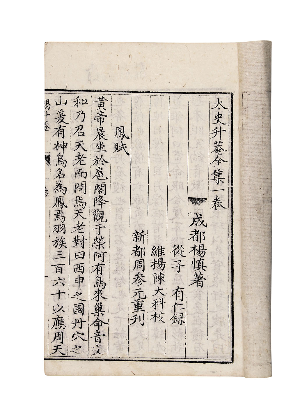 提 要: 是书为诗文集,白纸写刻精整,墨色乌黑,品相佳。杨慎(1488-1559),字用修,号升庵,杨廷和之子,公认为明朝三大才子之一, 明代文学家,汉族,四川新都(今成都市新都区)人,祖籍江西庐陵。少年时聪颖,十一岁能诗,十二岁拟作《古战场文》,人皆惊叹不已。入京作《黄叶》诗,为李东阳所赞赏。正德六年,殿试第一,授翰林院修撰。