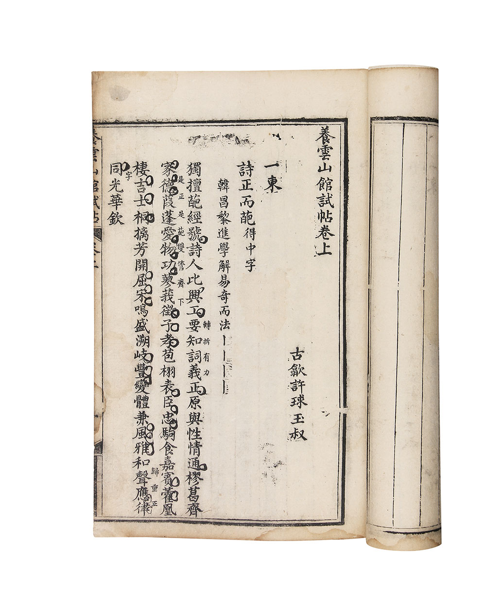 是书通篇写刻上板,乃为举子业而编辑。许球,字玉叔,安徽歙县人。道光三年(1823)进士,历官至河南监察御吏、兵科给事中。提出的禁烟措施后来多为林则徐所采用。著有《西台奏议》、《古今体诗》等书。