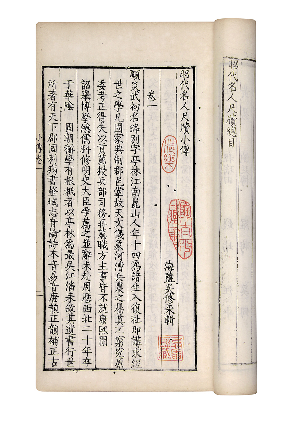是书板框狭长,未加衬纸,全书文字皆为工整端正的小楷手写上版,展卷之下悦目赏心。书中收录清代名人如顾炎武、黄宗羲、黄宗炎、傅山、毛晋、宋曹、王时敏等六百余人小传,颇具史料价值。
