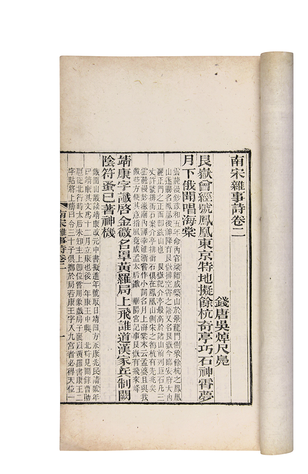 是书为白纸印本,天头开阔。此书是一部咏史诗专集,作者为清中期杭州沈嘉辙、吴婥等七人,各作七言绝句一百首,其中符曾多作一首,共七百零一首。其以诗作加小注的形式,歌咏南宋皇都杭州城一百余年的风貌。