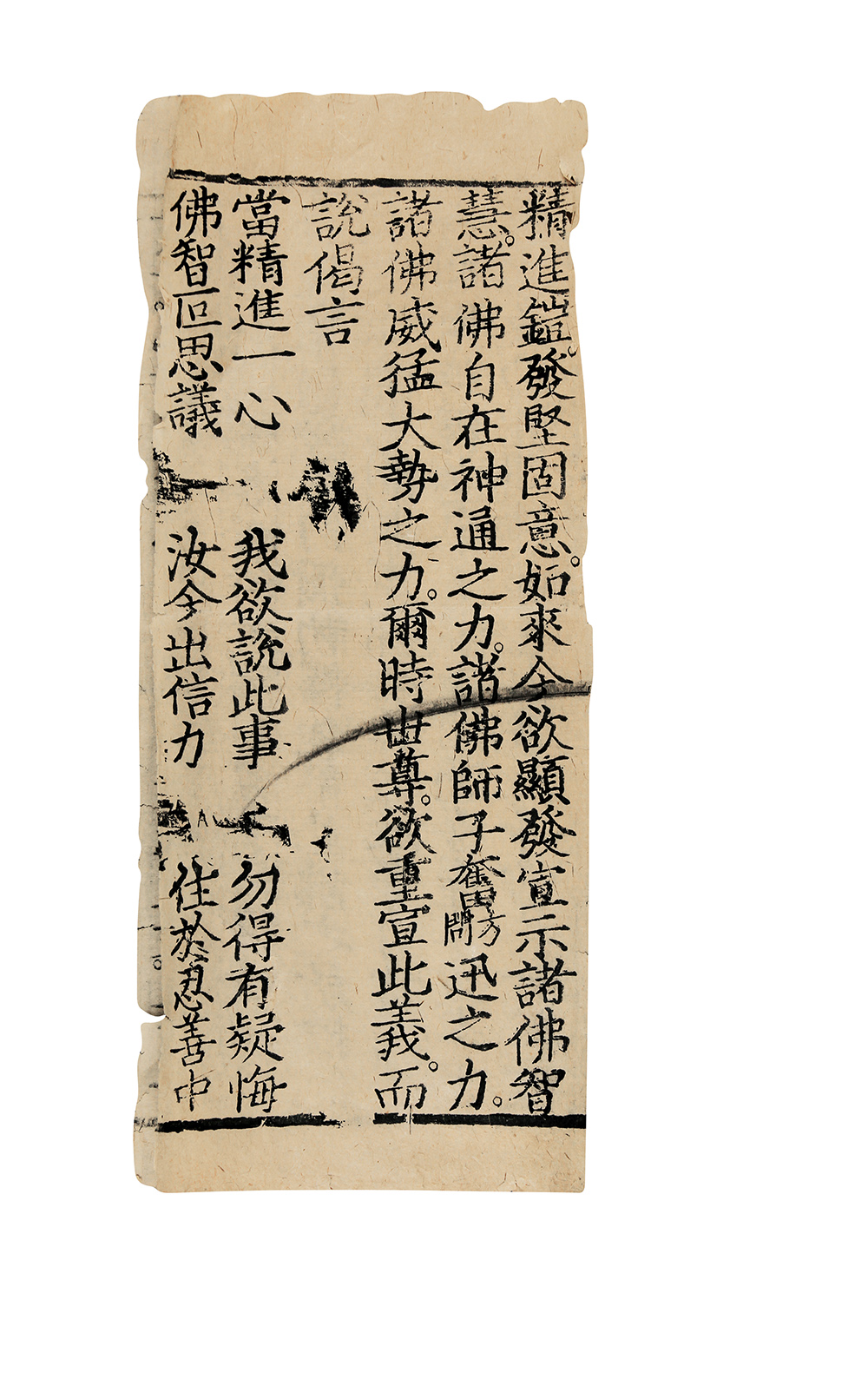 拍品纸色略黄,赵体字篆刻较精,每折6行,行18字。为《法华探微》“世尊!此诸无量无边阿僧祇菩萨大众,从何所来……住于忍善中”部分。