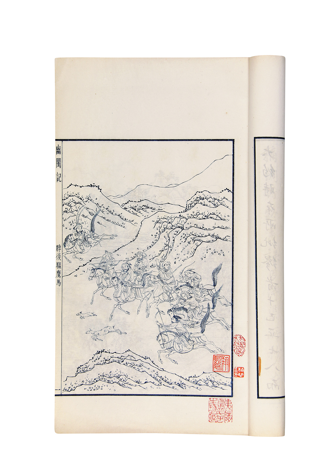 是书纸白如玉,书前版画二十幅,印製尤为精美,揽之悦目,不愧为民国石印本中的精品。此书全称《幽闺怨佳人拜月亭记》,述蒋世隆、王瑞兰爱情故事,为四大南戏之一。陶湘印书素以精工著称,书中多附有大量插图。今现此本,且为蓝印,藏家自当宝之。