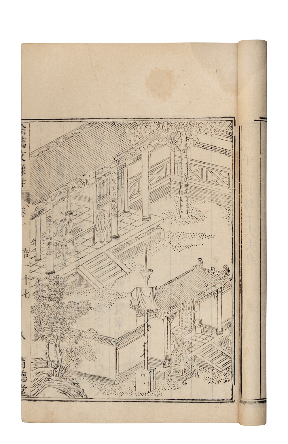 提 要: 是书老装旧函,内有插图一百九十余幅,绘製精细。此书又名《丹桂籍》,第一册书题签“敬道堂绣像丹桂籍”,然其版心下方皆有“育德堂”三字,当是育德堂刻本。此书记载大量关于积德行善、广行阴功、劝人向善的故事,用以警世。《阴骘文像注》一书在民间流传甚广,刊本亦多,然因多为民间书坊所刻,故大多恶俗不堪,而若此本开本宏阔,插图刊印精整者,实不多见。