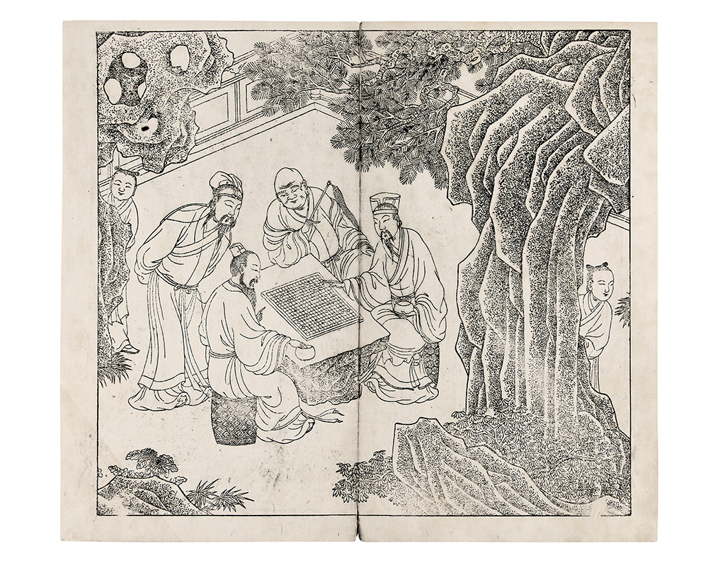 拍品册页装,内收图六幅。此册所收乃《坐隐先生订棋谱》中书首的《坐隐图》,绘製的是坐隐先生汪廷讷坐隐园雅集的情景,雕刻细致,人物造型生动,刻画细致清晰,线条细若毫发,山石结构、水浪波纹等一一呈现,可见徽派版画的特点。