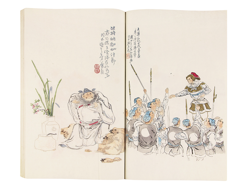 此书原装原函,开本宏阔,品相完好。拍品卷末有数张利用拱花技艺印製的笺谱,另外还有一张反映大泽乡起义的笺谱是后来刊刻的《荣宝斋诗笺谱》都没有的,在各种版本的《诗笺谱》中颇具特色。