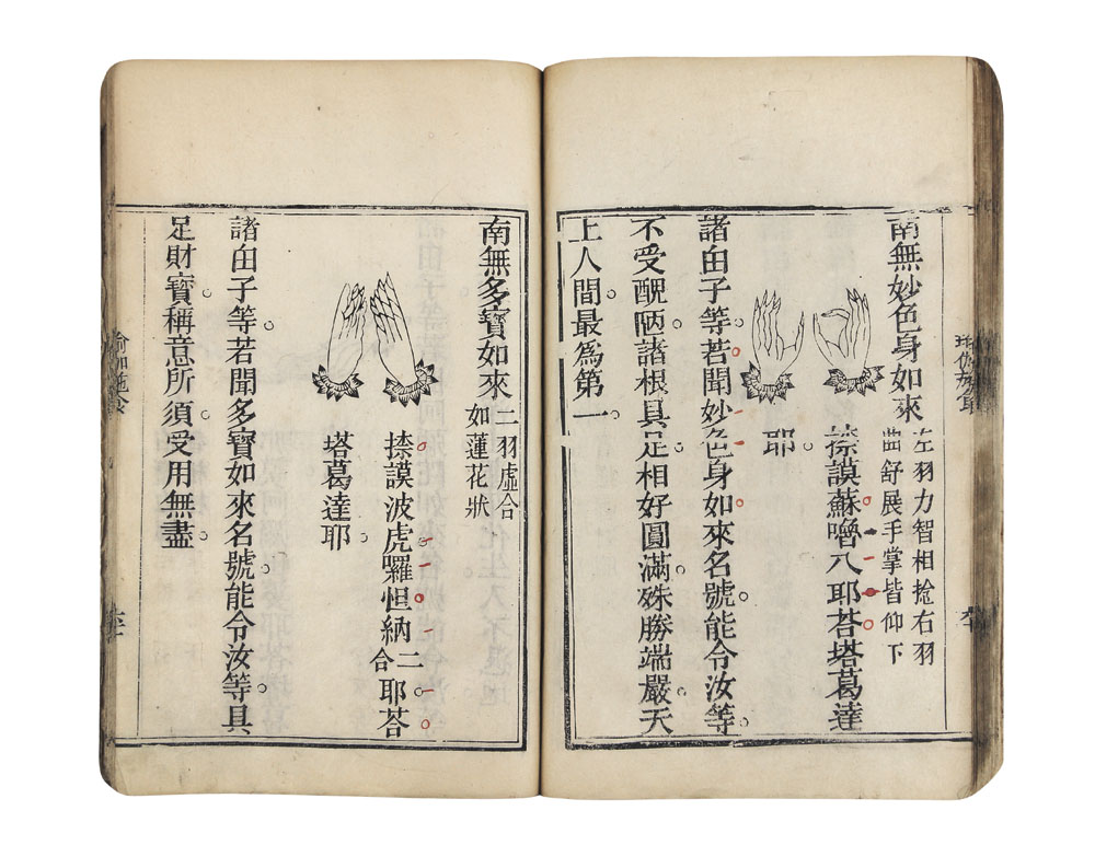 是书为宗教典籍,开本宏阔,版式疏朗大气,方体大字,内有手印版画数幅,后附出资人名单,刻印俱佳,保存完好。
