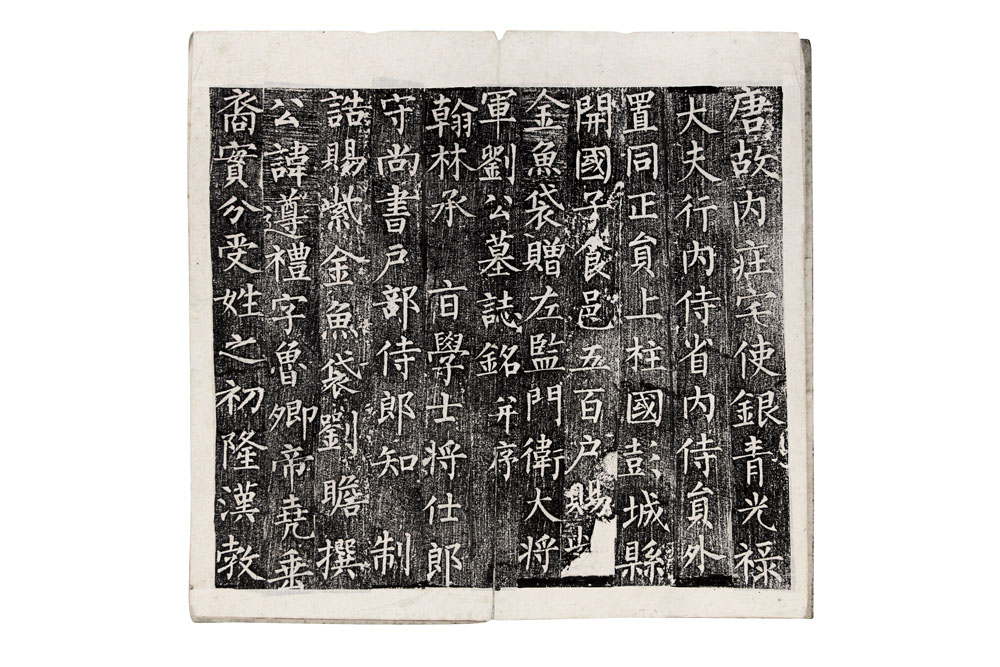 此墓志铭为唐代银青光禄大夫刘尊礼墓志铭,拓印清晰,品相完好。刘尊礼,字鲁卿,曾祖刘英,刘宏规之第五子,世家历代为官。刘尊礼自小聪慧,宝曆二年即入仕为官,政绩突出,官至银青光禄大夫。娶咸阳县君田氏为妻,育有四子。咸通九年病逝,时年五十三岁,死后追赠左监门卫大将军。