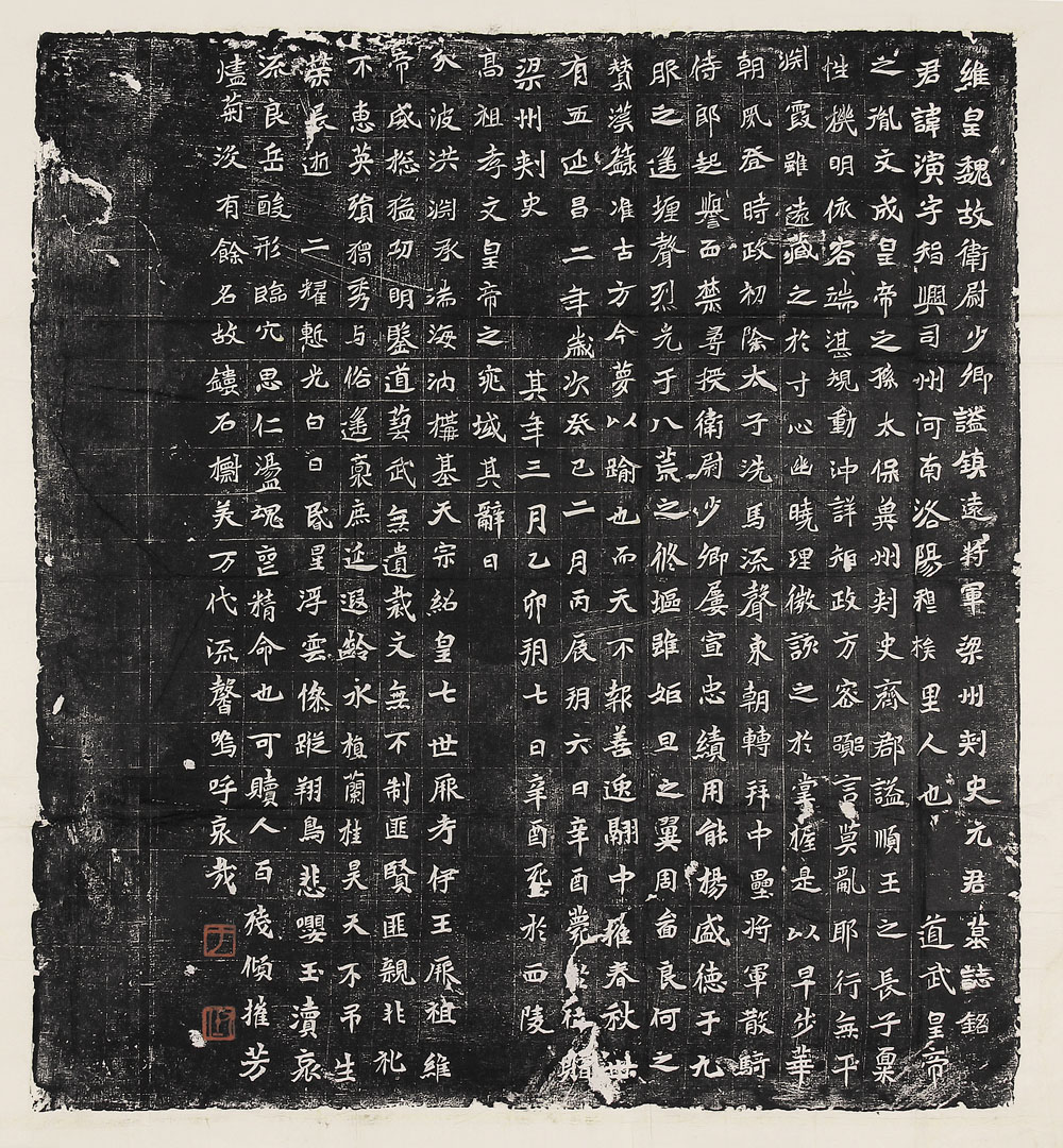 拍品为北魏梁州刺史元演的墓志铭,魏碑书体,拓印清晰,品相完好。元演,字智兴,北魏道武帝拓跋珪的后裔,文成帝拓跋濬之孙,太保冀州刺史齐郡谥顺王拓跋简的长子。