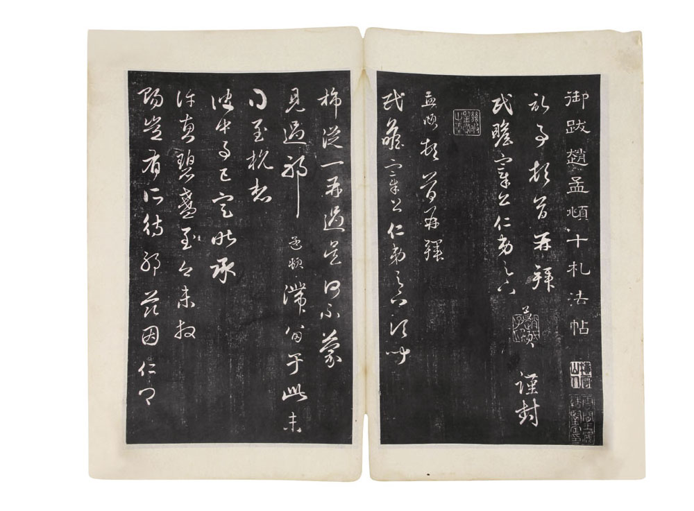 此为元代书法家赵孟頫书法拓本,拓印精致。封面题“张瑞庭赠”,张瑞庭为民国间的爱国军人。赵孟頫的《行书十札卷》为十通尺牍合装卷,均为亲友之间关于家庭琐事的通信,写来信手随意。真迹曾呈于内府,乾隆鉴赏后跋于其上,此拓即据以摹刻。