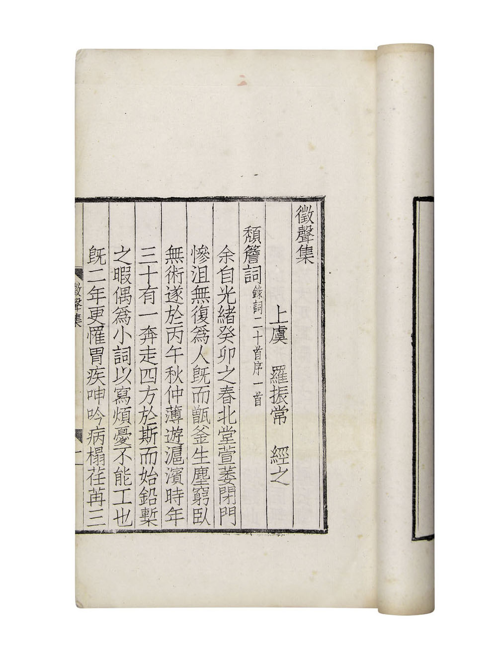 提 要: 是书为罗振常父女诗集,为白纸印本,行格舒朗,摆印规整。《徵声集》,罗振常撰,书末有“太岁在辛酉夏上海蟫隐庐用仿宋聚珍字铸版印行”条记;《初日楼稿》,女史罗庄撰,书末有“辛酉孟秋上虞罗氏铸板印行”条记。罗庄(1896-1941),词坛才女,近代学者、藏书家、版本目录学家邈叟老人罗振常之女,雪堂老人罗振玉之侄,著名版本目录学家周延年(子美)之妻。