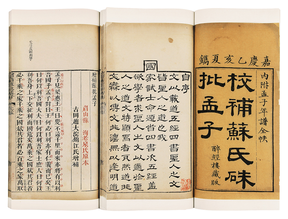 提 要: 《孟子》苏洵批本,至朱氏《经义考》始载此书,称《苏氏洵孟子评》一卷,云有明套印本。此书系评点《孟子》之作,观其评文,主要着眼于文意及辞语的品评,清赵锦江又参校明其它各家评本做了补注,可谓各家评本的精选汇辑,又为硃墨套印,注文正文一览便知,极便初学。拍品金镶玉装,品相颇佳。