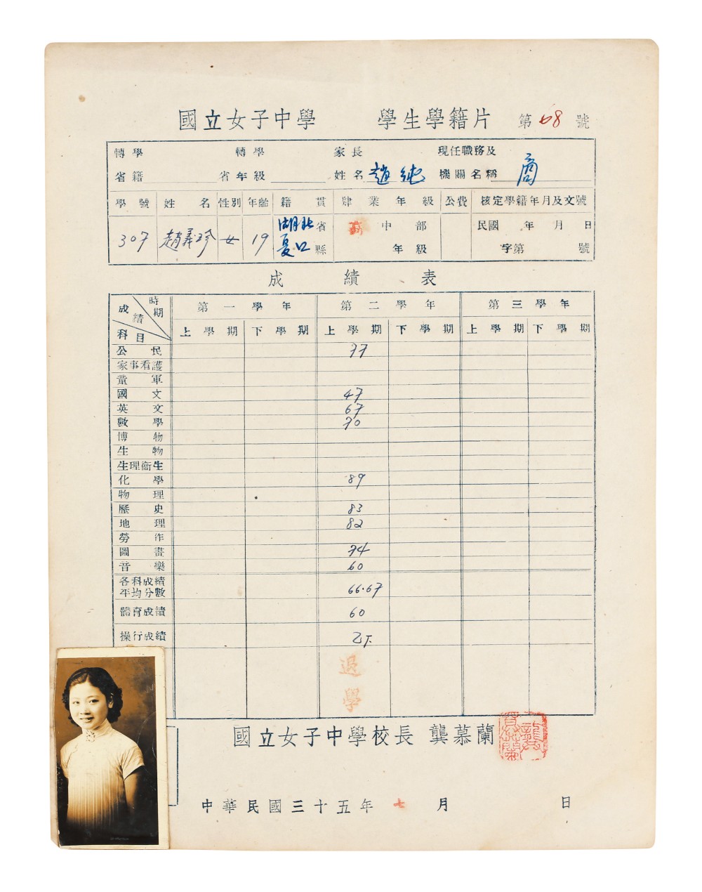 提 要: 七七事变后,大批青少年流落到大后方,不仅衣食无着,一时也无书可读,形势十分危急。故教育部从1937年12月开始,着手筹建专为接收战区流亡学生的国立中学。1942年8月,在四川合江专门成立了国立女子中学,拍品为民国三十五年国立女子中学学生学籍表,包括第51至66号、第68、69号、第954号,及高十一班42名学生,民国三十三年入学学籍册一册,均附每名学生照片、资料信息、学习成绩等信息。