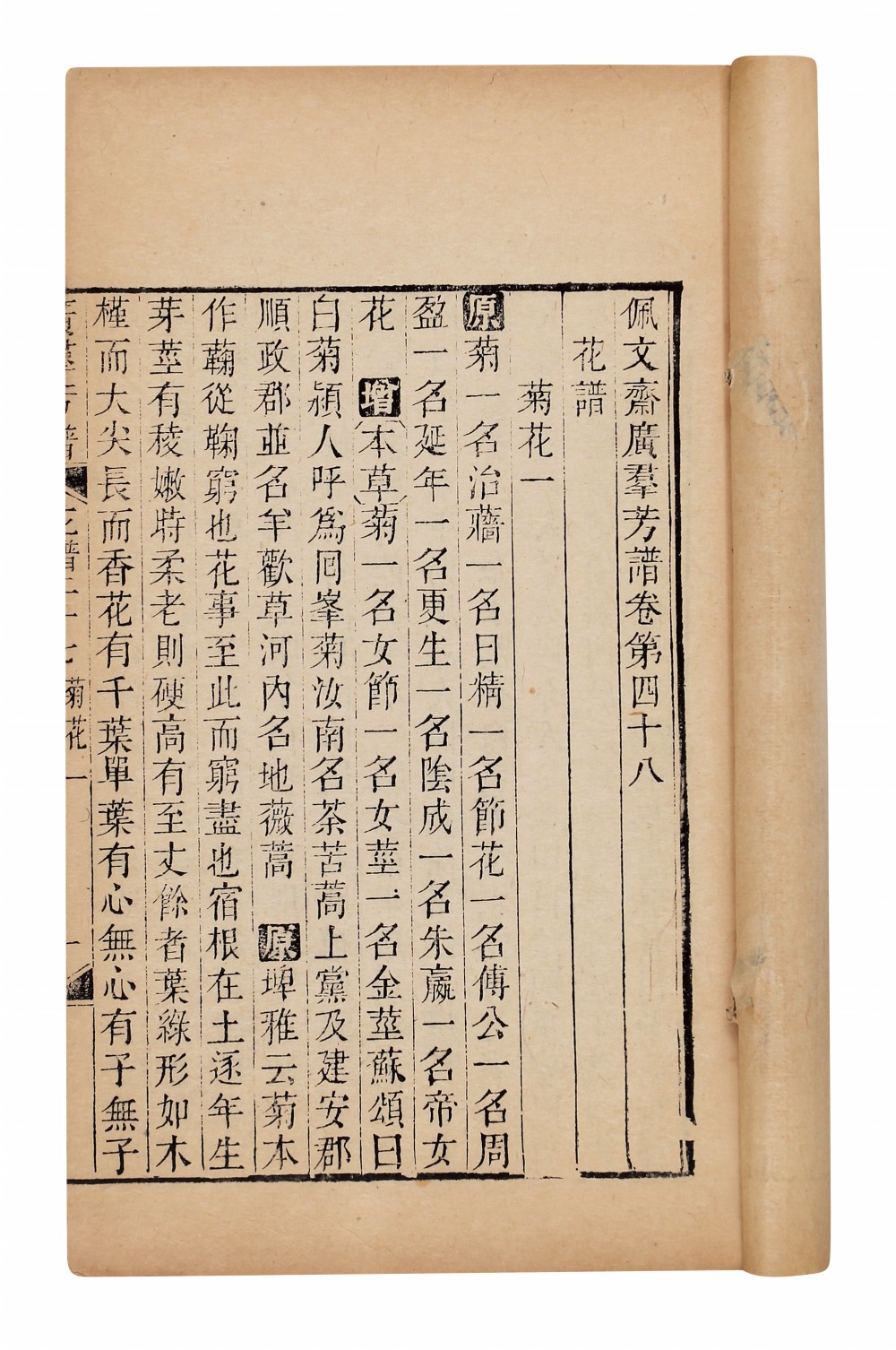 提 要: 是书分“天时”、“谷”、“桑麻”、“蔬”、“茶”、“果”、“木”、“竹”、“卉”、“药”等11谱,共记载了当时植物1517种。每种皆一一溯委穷源,详述形态、栽培、利用、典故及艺文等事,实为我国古代植物学集大成之作。拍品不全,存“花”、“果”、“木”、“竹”、“卉”五谱,卷四十八至卷六十八、卷七十一至卷九十二。