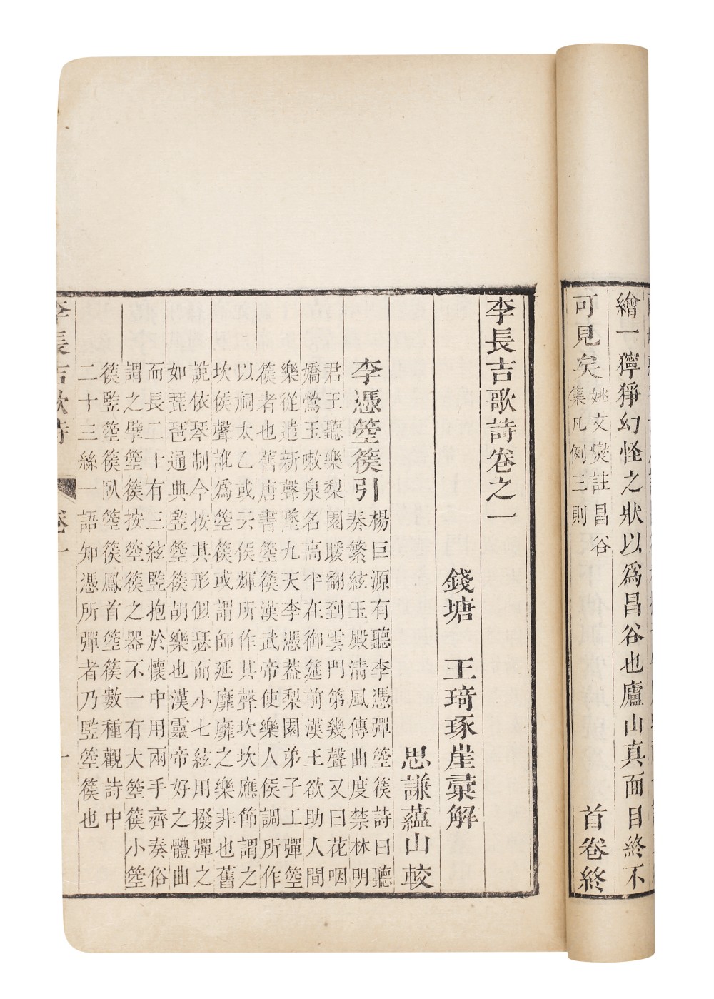 提 要: 是书老装未衬,天头极为开阔,版面爽朗,字形整饬。李长吉诗世以为奇险,宋人谓之鬼才。该书为清王琦自辑自刻之本,其兼采诸家之本,汇为一编,内收李氏平生所著歌诗二百三十余首,为李長吉歌詩最善本者,以注解精到著称,拍品为其初刻之本。目录末有紫然居士墨笔跋文一则,款“廷”、“奭”姓名印。紫然居士即觉罗廷奭(1844-©),紫然居士为其号,字紫然,又字棠门,号饭石道人。能画山水,喜吟咏。著有《留春消夏集》。著录:《中国古籍善本总目》P1210