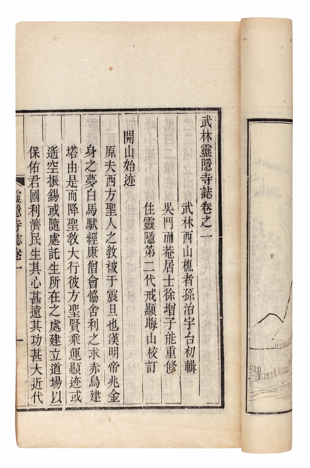 提 要: 是书老装未衬,天头开阔,字形整饬。首收灵隐寺志图十一幅,绘刻精细,对灵隐寺及其周边精致罗列颇详。拍品八卷全,内收开山、重兴、山水、梵宇、禅祖、法语、檀越、人物、艺文等十余目,于灵隐寺历代沿制、大德、艺文阐发甚深。 灵隐寺,又名云林寺,位于浙江省杭州市,背靠北高峰,面朝飞来峰,始建于东晋咸和元年(326),江南禅宗“五山”之一。 是书初刻在康熙二年,今传本稀少,民国及解放后再版以丁丙此刻为宗,国图所藏最早版本亦此丁氏刊本。