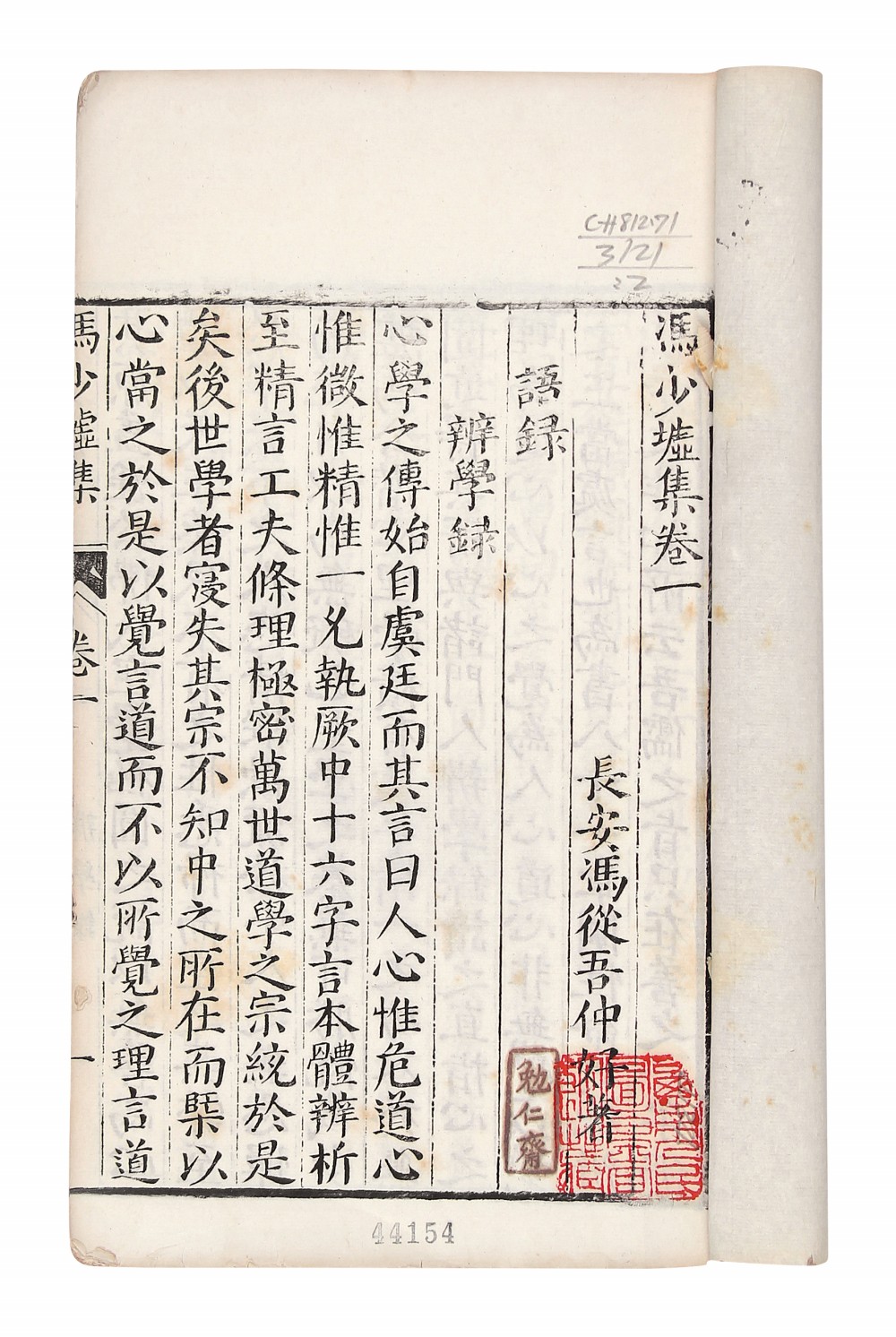 是书为明代冯从吾的文章总集,仅存《冯少墟集》二卷。冯从吾为明万曆十七年(1589)进士,仕至工部尚书,其文集初刻于万曆四十年,康熙时冯氏子孙以未刊稿重刻刊行,故内容较《冯少墟集》更加完备。
