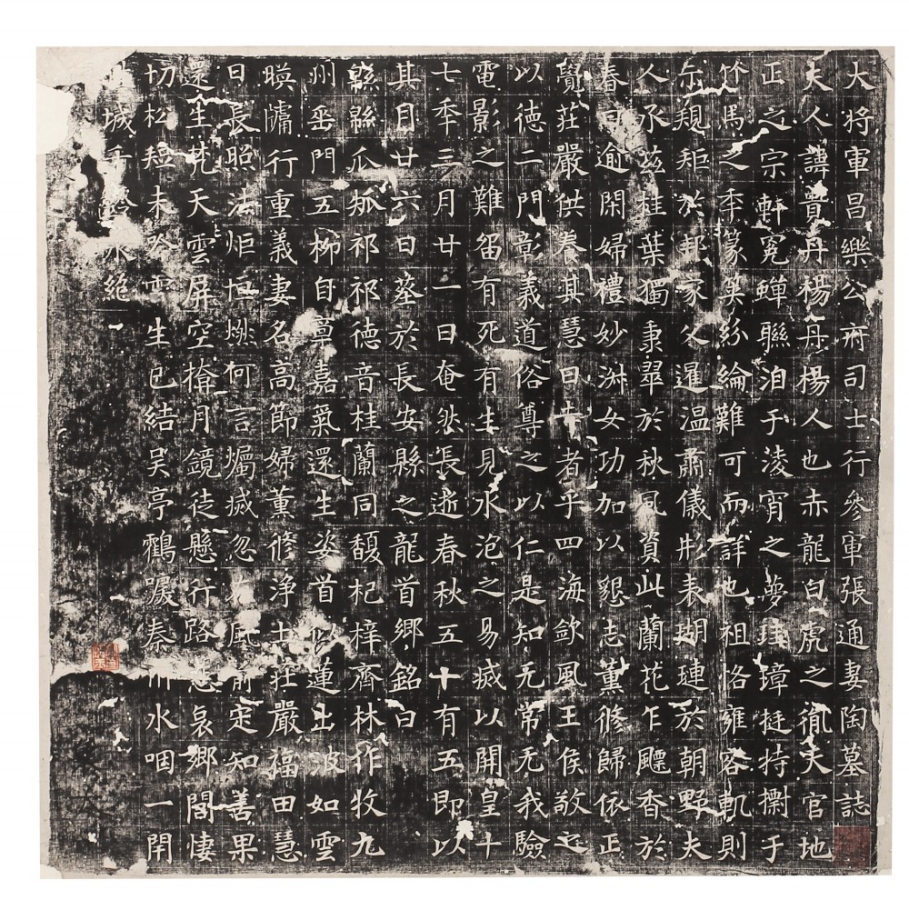 提 要: 此为原石拓本,极为罕见,与世面所见翻刻本大有不同。其中最重要的鉴定要点就是第十四行的“似”字撇画下有一石筋痕,如弯月倒挂,这种自然的石筋是极难用人工方法模仿的,是这个著名墓志的鉴定关键(见图示)。另据藏印可知,此本曾经清同治年间知名书画鉴定家何瑗玉收藏,何瑗玉,清道光、咸丰年间人。字蘧盦,又号莲身居士,广东高要人,著名篆刻家何昆玉(字伯瑜)的胞弟。官至翰林院待诏。富收藏,精鉴别,喜好金石拓片。此墓志在中国书法史上极具盛名,其书法遒劲婉约,锋颖如生,可与《董美人》、《龙藏寺》两志媲美,堪称隋志之翘楚,历来评价极高,是临习隋楷的最佳范本之一。在清末就出版过整张石印本(见右侧第210号拍品)。解放前上海有正书局、艺苑真赏社分别出版有石印本和珂罗版整纸本,流传颇广。原石在乾隆末年的西安出土,一出现便引发书法界的震动,但到道光年间出版的金石书中就已经将原石列为亡佚。之后曾有两个翻刻的石头曾经出现,一时又引起轰动:一石为岑建功旧藏,后裂为四块,最终被徐乃昌得到;另一块则翻刻更精,为西安当地翻刻的,还被打磨过一次,字体更加清秀,几可乱真。后来徐氏藏石不知所踪,西安翻刻石则被张伯英所得,1952年由张氏后人捐赠给西安碑林。至此看来,其石最迟在清道光咸丰年间就应该已经毁掉,传世拓本则多以翻刻本唯多,原石拓本极为罕见。此为隋代小楷中的代表作,而且是极为罕见的原石拓本,又曾经名人收藏,实在难得。著录:《中国碑拓鉴别图典》P427
