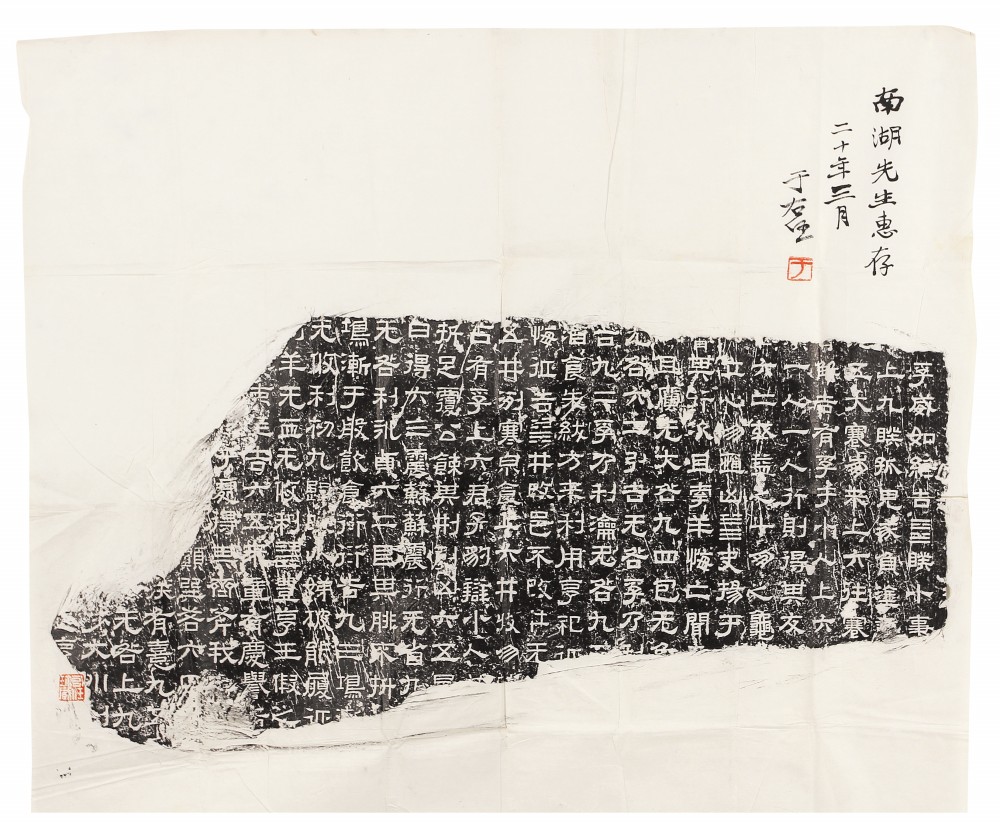 拍品为熹平石经《易经》部分拓片一张。熹平石经立于东汉熹平年间,后毁于战火。1922年,洛阳出土数块残石,当时于右任、马衡等人大力购藏,现大多藏于公共博物馆。