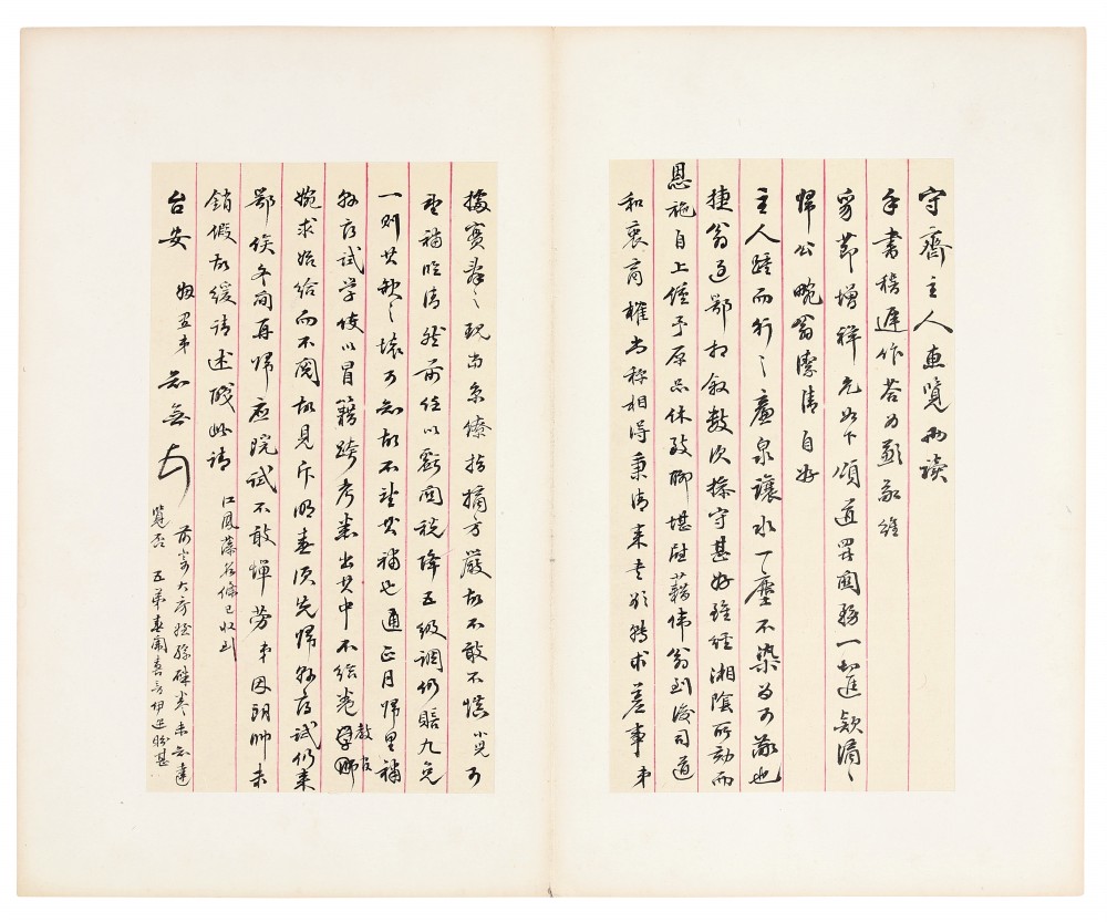 提 要: 拍品经折装,为彭祖贤致文柟、守斋信札十通十九页。彭祖贤(1819-1885),字兰耆,号芍庭,彭蕴章四子。咸丰五年(1855)举人,历官至顺天府尹,光绪四年(1878)授江西布政使,擢湖北巡抚,权湖广督篆而卒。尝辑刻《长洲彭氏家集》。拍品当写于彭氏任湖北巡抚期间,信中有“此间通省仅有十营,内系边境及武汉要会,不可无营”等语,提到其时各省发生劫案、加收川淮盐价、会匪之事、法越战争等。封面有墨笔题签“彭为亭中丞书札”,款“庆龢署检”,并钤有“公穆”印一枚。此签为陈庆龢手写,陈庆龢(1871-©),字公穆,一字悟庵,广东番禺人,经学大师陈澧长孙。贡生,历任广雅书院分校菊坡精舍学长、内阁额外中书。入民国后历任国务院咨议,外交部秘书兼参事,驻檀香山领事。建国后聘任中央文史馆馆员,著有《述训》上、下篇,《容园杂钞》等。