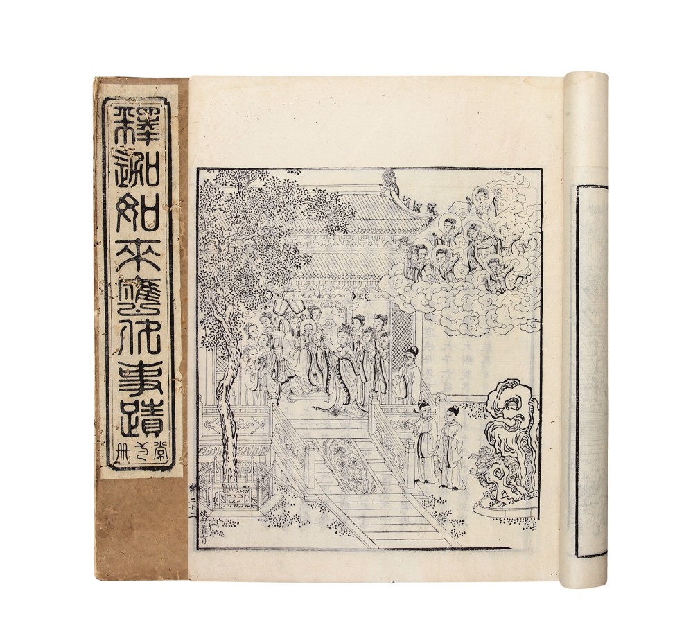 提 要: 此书为清乾隆之子,镇国公永珊为广佛教之流传,历时八年而成。其后十五年,才由和硕豫亲王裕丰,於嘉庆十三年(1808)印成,版存德胜门内大石桥弥勒院,拍品为光绪年间印本。拍品辑录了释氏诞生、出家、修行、成道、说法、涅槃、传承等应化事迹,开本阔大,右图左文,绘製精细,末尾题“由四川省成都府昭觉寺主持明照同大众职事经理募化镌刻,板存本寺藏经楼”字样,后附施资人名录。拍品缺第二册。